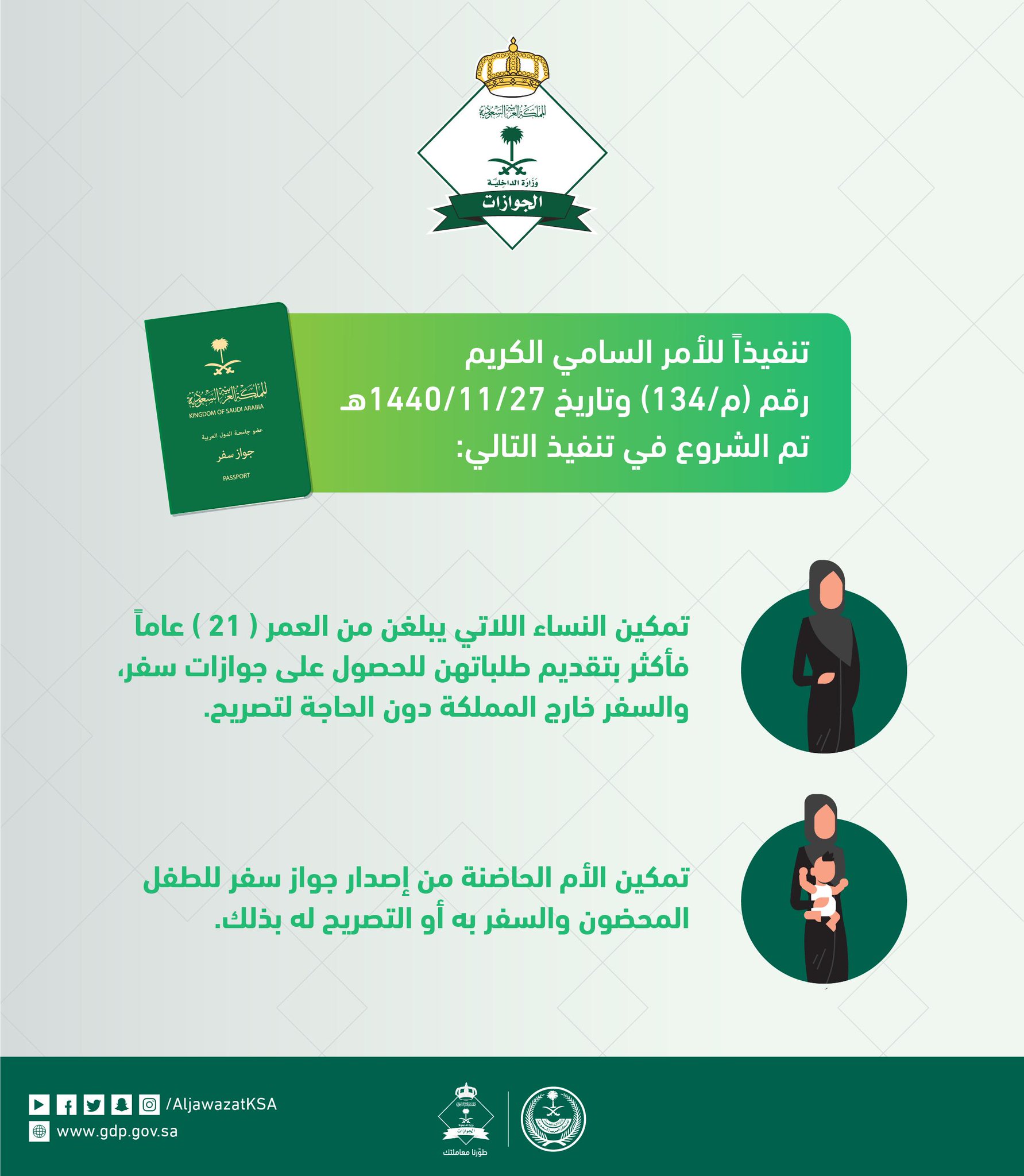 الجوازات السعودية On Twitter تنفيذا للأمر السامي الكريم رقم م 134 وتاريخ 1440 11 27هـ بدأت الجوازات باستقبال طلبات النساء اللاتي يبلغن من العمر 21 عاما فأكثر بإصدار أو تجديد جوازات السفر والسفر خارج المملكة