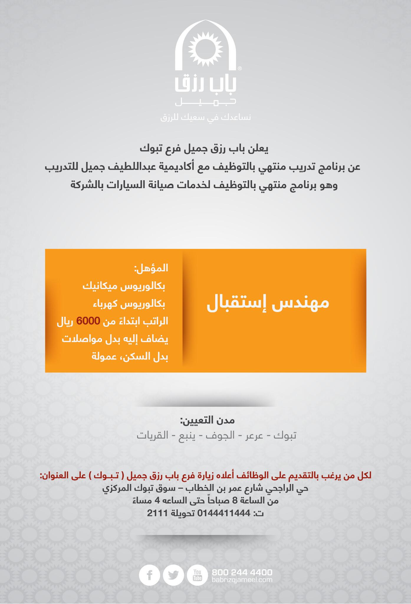 باب رزق جميل Bab Rizq Jameel On Twitter تدريب منتهي بالتوظيف للشباب في المنطقة الشمالية لوظيفة مهندس استقبال لمؤهل هندسة مكانيكا كهرباء تبوك عرعر الجوف Http T Co Srhhkobs4s